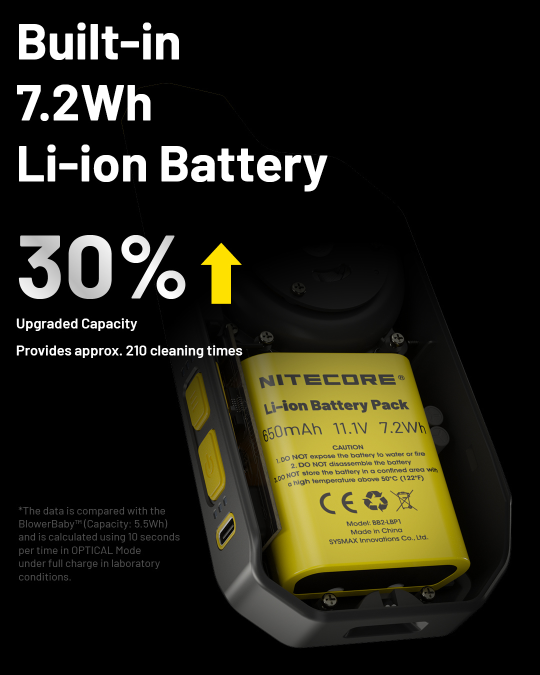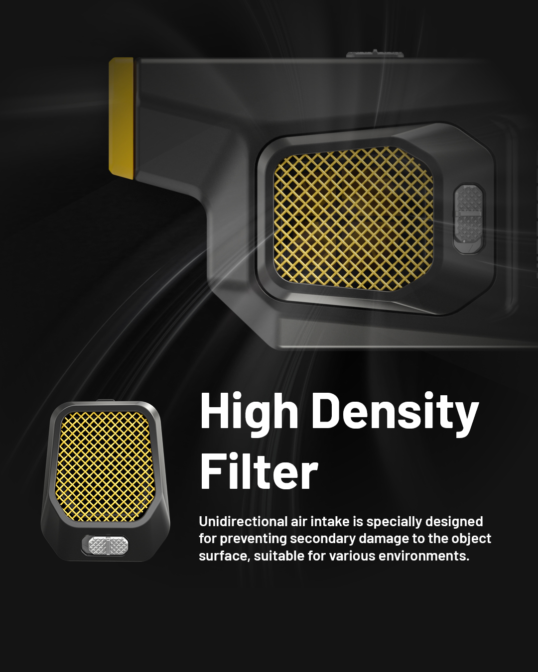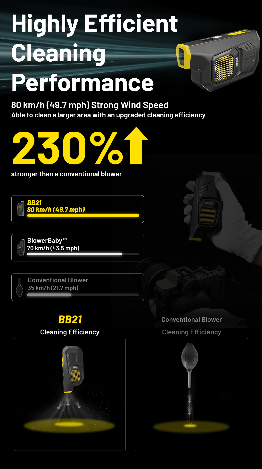 The BB21 features a 33.6W high-powered motor, optimized airducts, and a 42mm (1.7") integrated impeller. With a dust removal power of 2.7kPa and wind speeds reaching up to 80 km/h (49.7 mph), its ergonomic design ensures effortless one-handed operation.