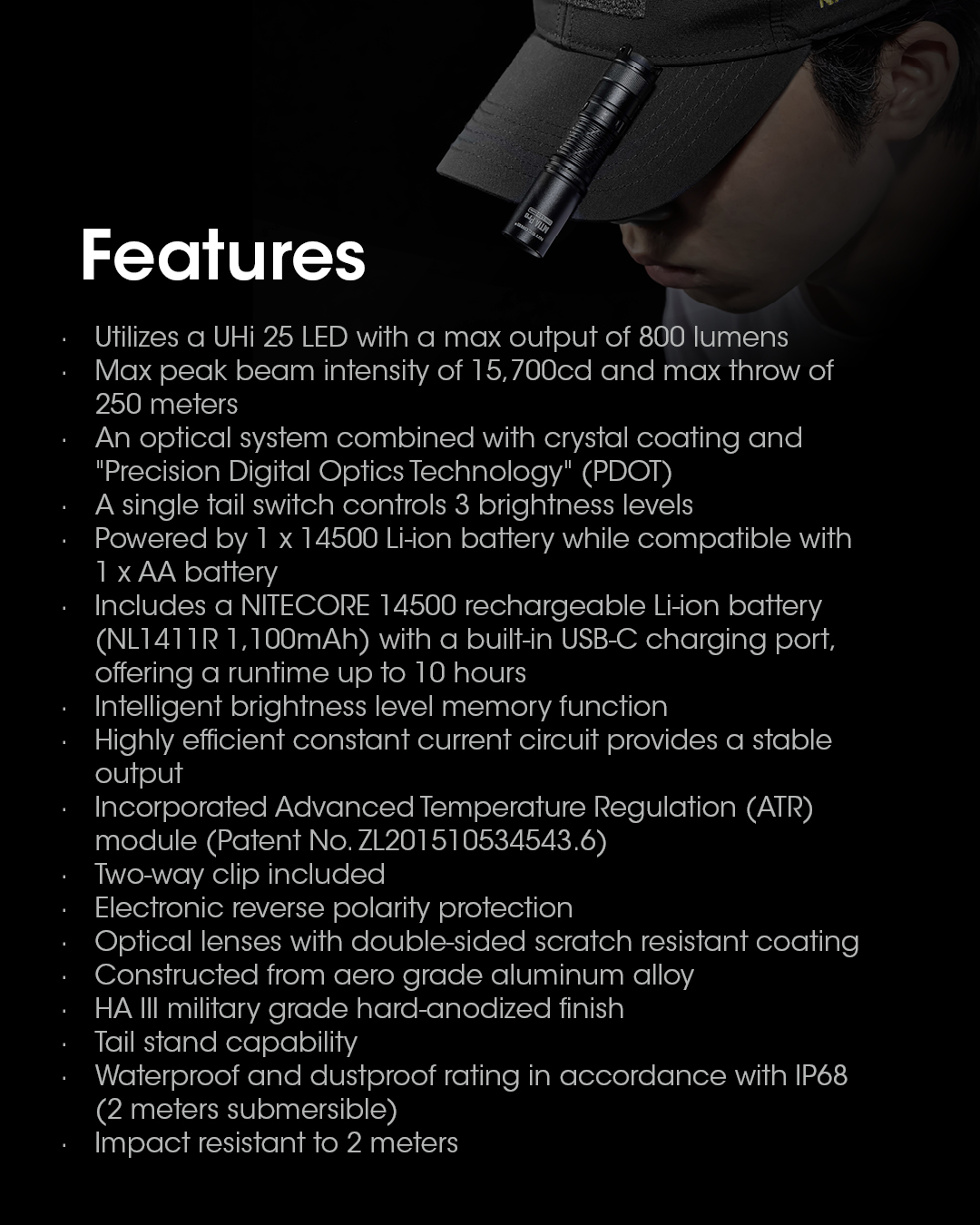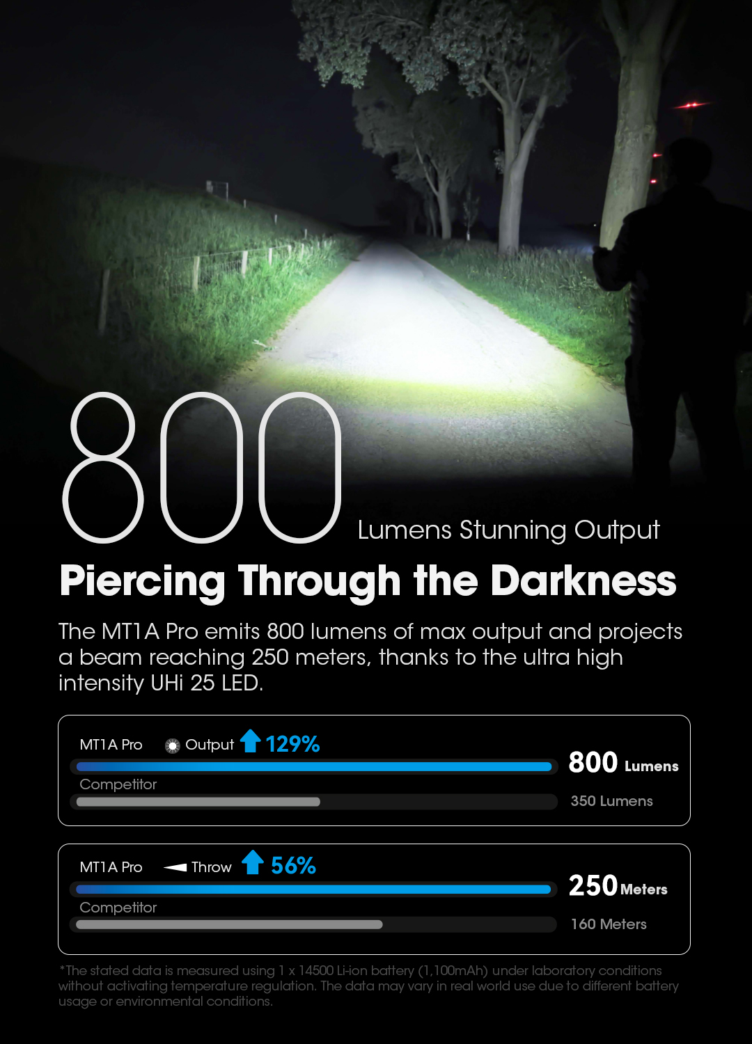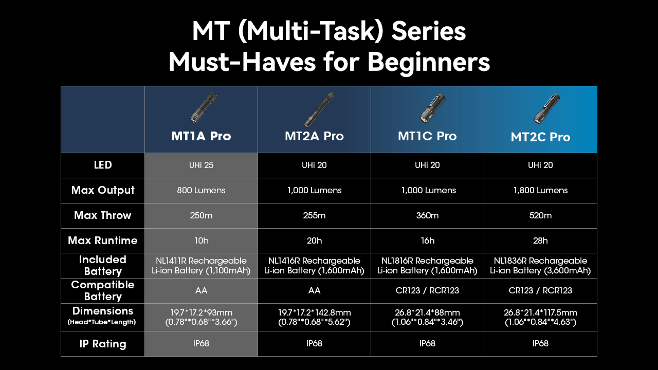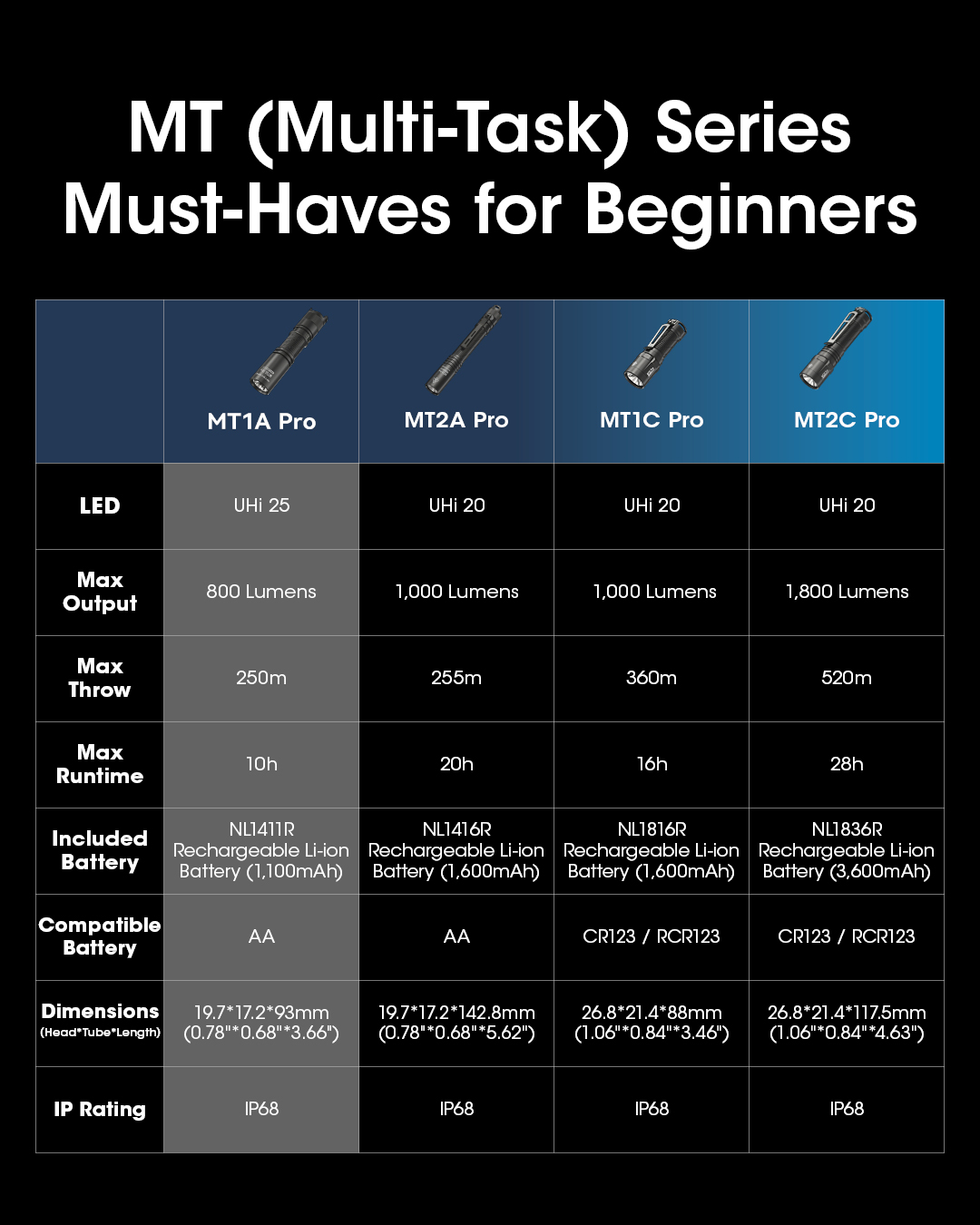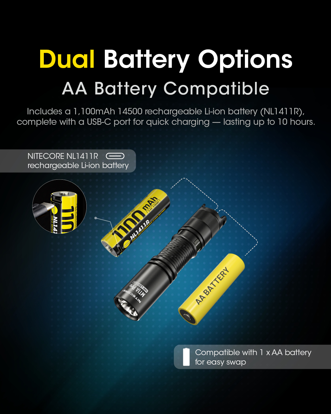 The MT1A Pro High Output Compact Rechargeable AA Flashlight is the first one to pack the NiteLab UHi 25 LED. It blasts up to 800 lumens over 250 meters, weighing at 52g (1.83 oz) (battery included) with a length of 93mm (3.66"). It includes a USB-C rechargeable Li-ion battery (NL1411R 1,100mAh) and also works with 1 x AA battery.
