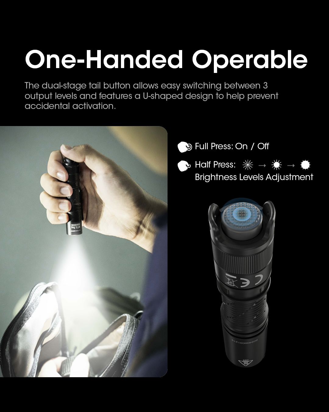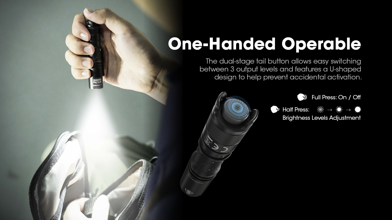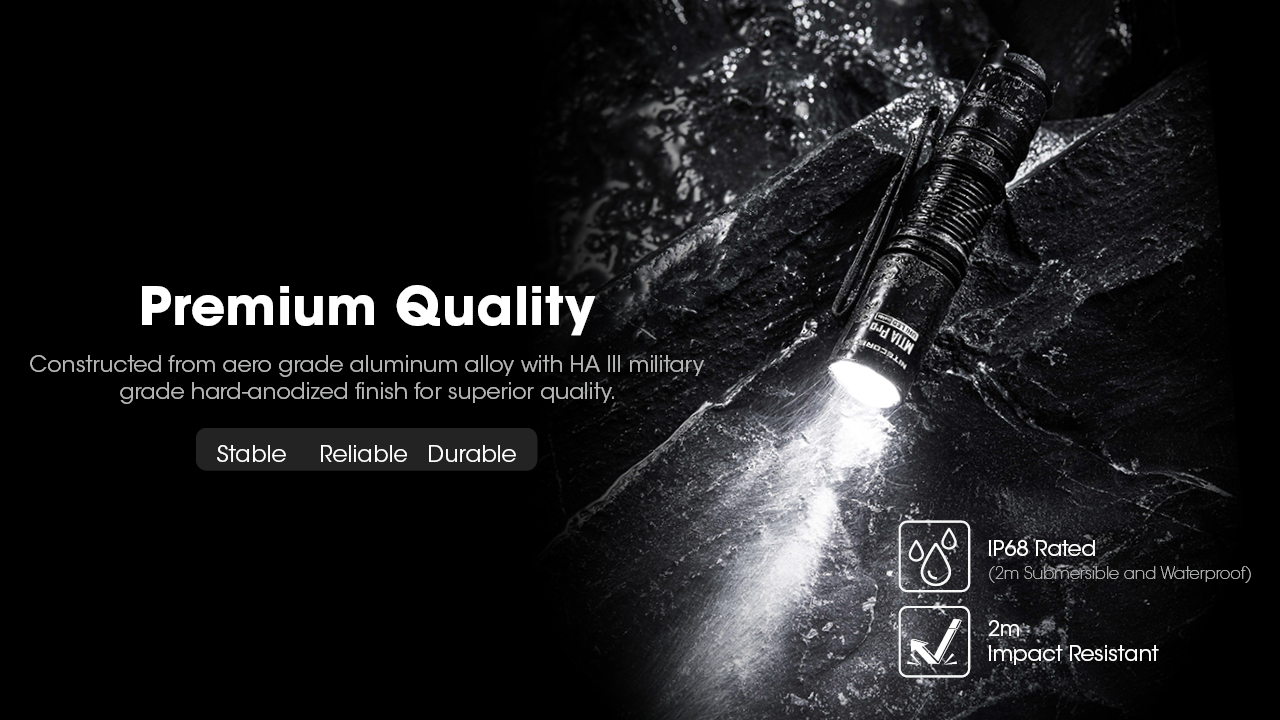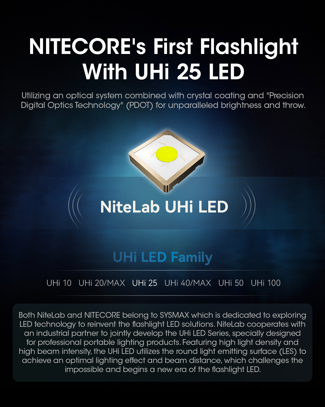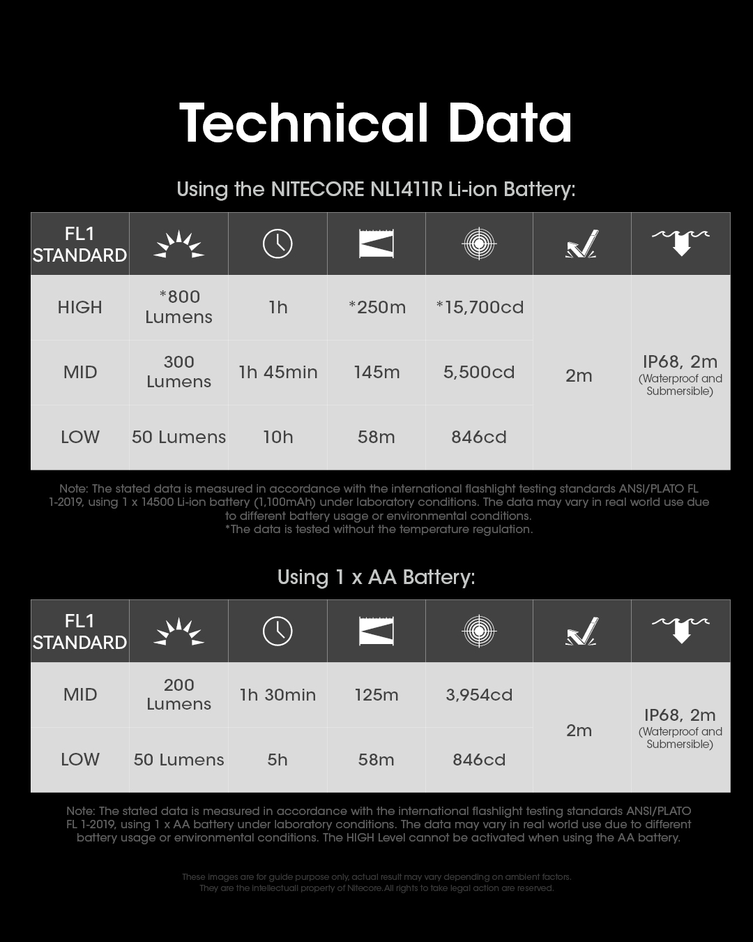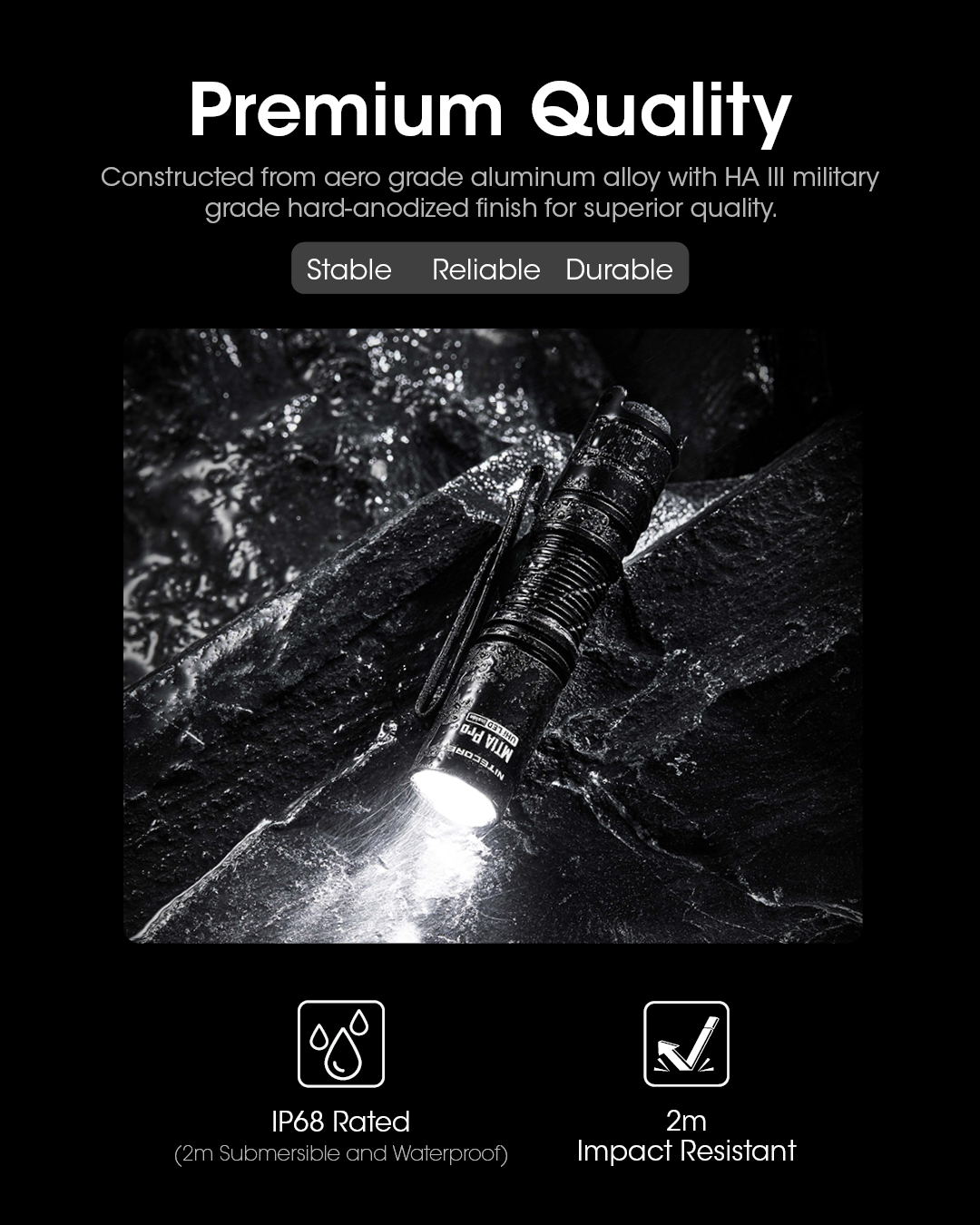 The MT1A Pro High Output Compact Rechargeable AA Flashlight is the first one to pack the NiteLab UHi 25 LED. It blasts up to 800 lumens over 250 meters, weighing at 52g (1.83 oz) (battery included) with a length of 93mm (3.66"). It includes a USB-C rechargeable Li-ion battery (NL1411R 1,100mAh) and also works with 1 x AA battery.