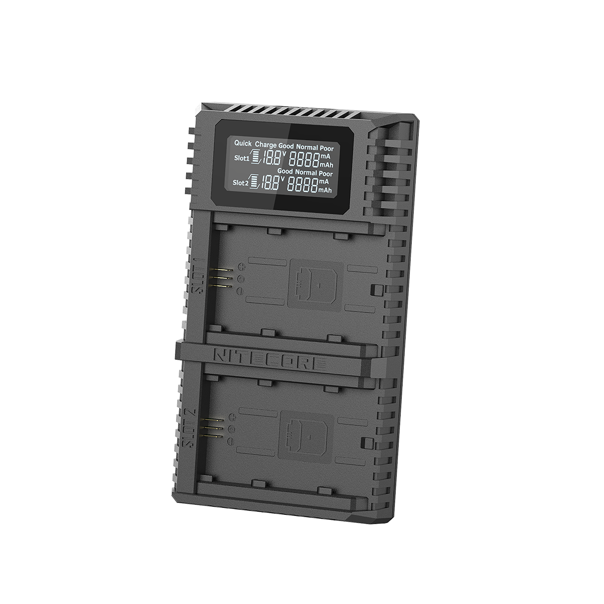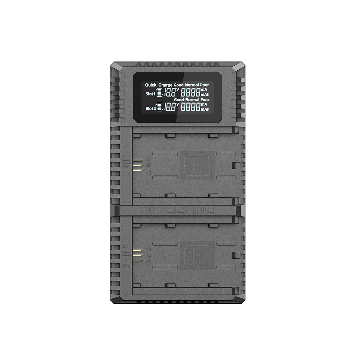 USN4 Pro is QC 2.0 available charger which can charge two NP-FZ100 batteries simultaneously with the USB input and display real-time information of the charging status.